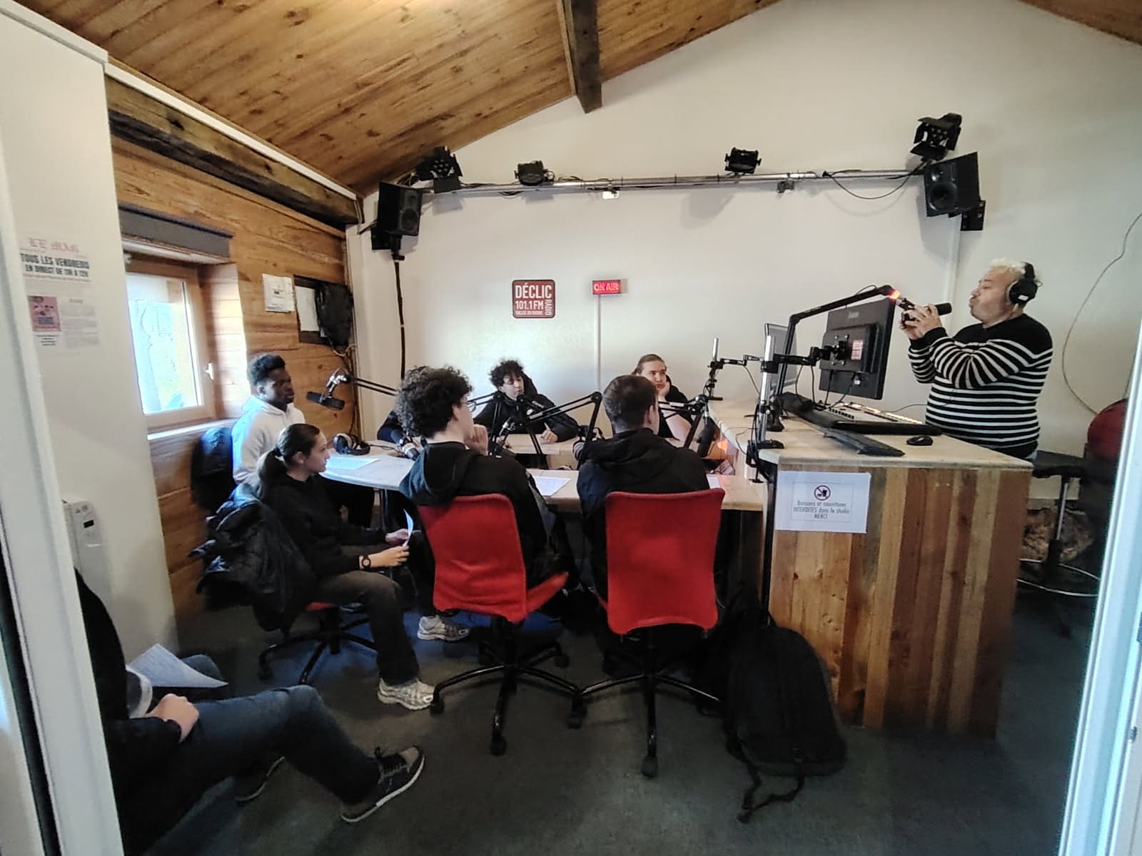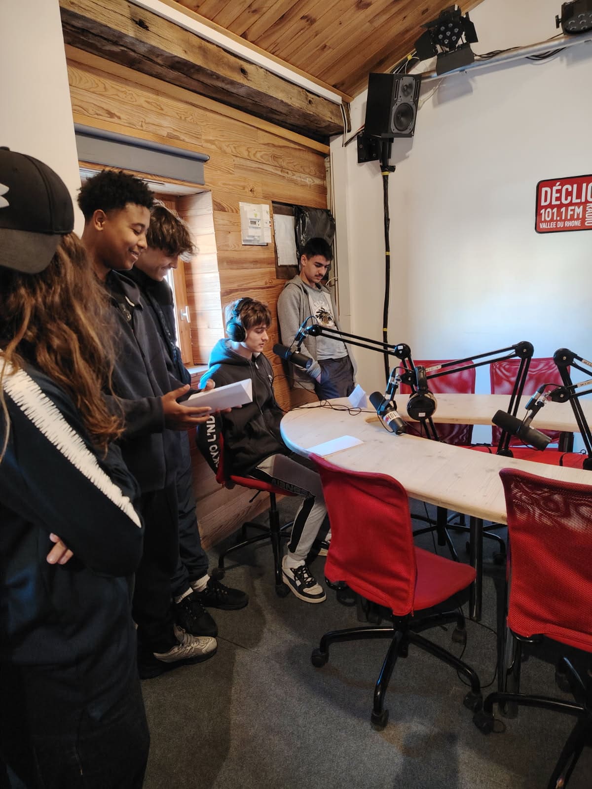 Après une présentation du studio d'enregistrement de Déclic Radio 101.1 FM par Seb et Clément (qui officie aussi sur la radio associative BLV), où les élèves ont pu comprendre le fonctionnement technique de la console & des micros, mais aussi celui de la grille de diffusion avec les différentes émissions, les jungles, les spots, les élèves ont réalisé leur premier passage au micro.
